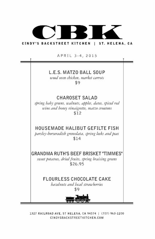 April 3rd and 4th CBK (Cindy’s Backstreet Kitchen) in St. Helena will be having a Passover Menu. The menu contains Matzo Ball Soup, Charoset Salad, Housemade Halibut Gefilte Fish, Grandma Ruth’s Beef Brisket “TIMMES” and Flourless Chocolate cake. All items are ala carte. In the past Chef’s from CBK have come down to Congregation Beth Shalom in Napa and taught the art of making Gefitle Fish – my wife says they are the best she has ever had.